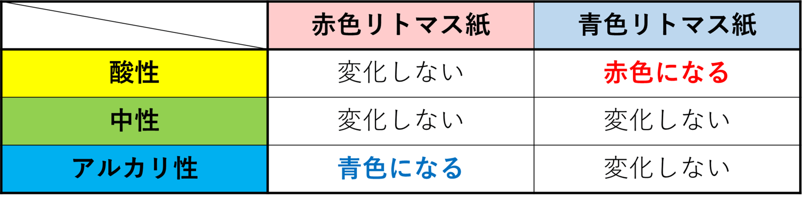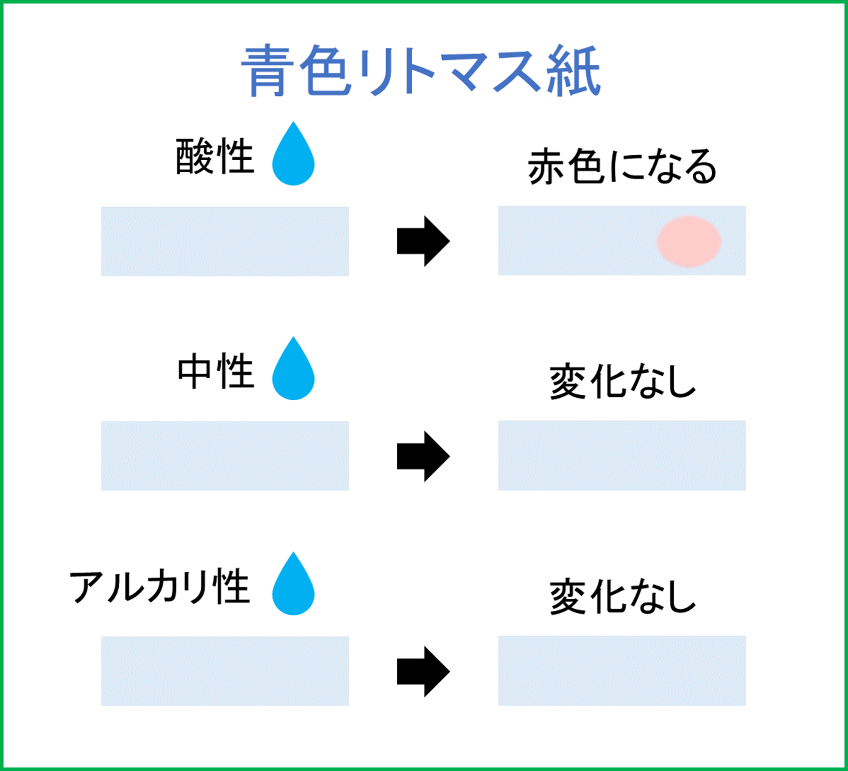 青色リトマス紙は酸性の水溶液と反応して赤色になります。逆にアルカリ性や中性の水溶液と触れても青色のままです。