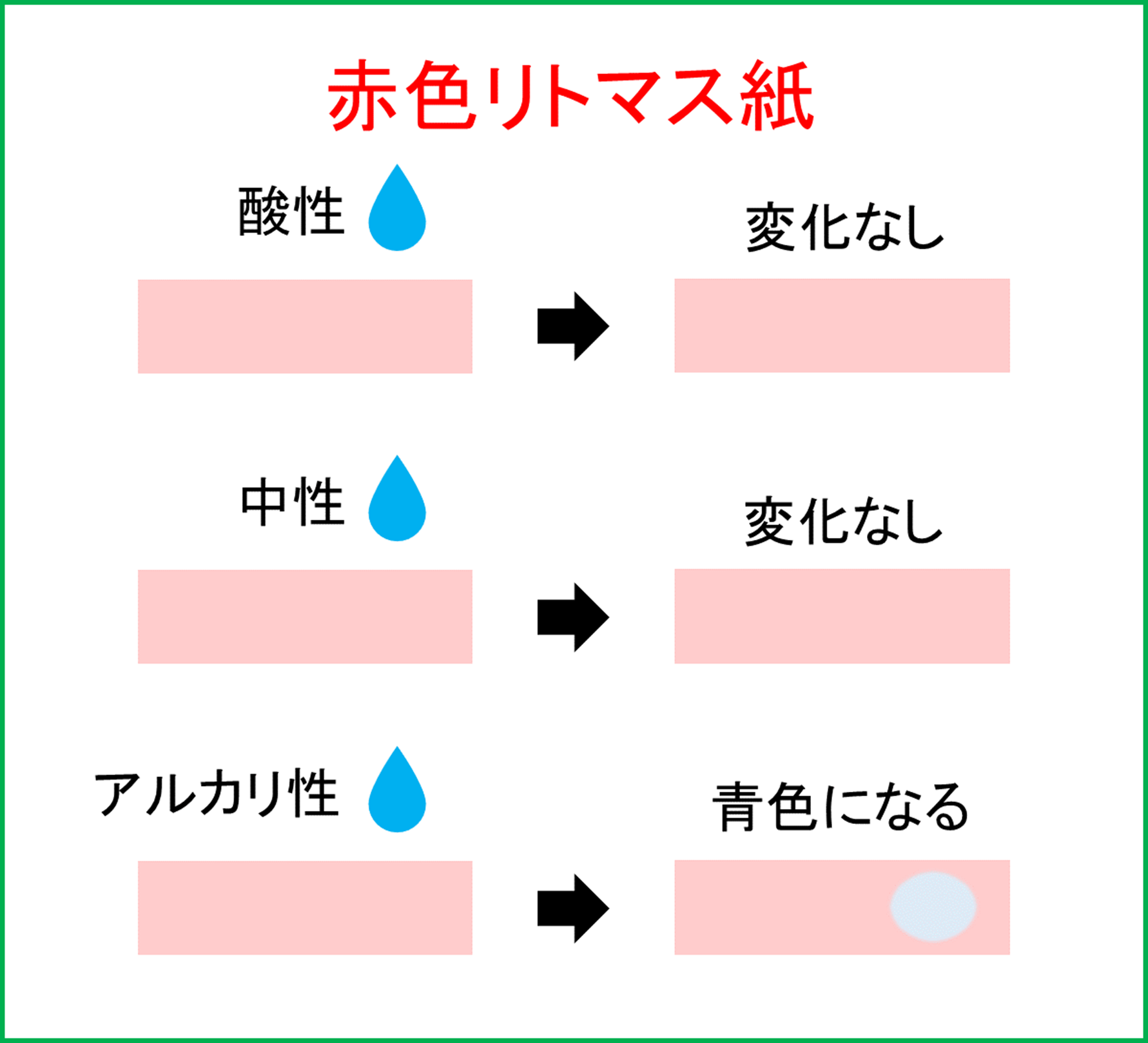 一方で赤色リトマス紙はアルカリ性の水溶液と反応して青色になります。逆に酸性や中性の水溶液と触れても赤色のままです。