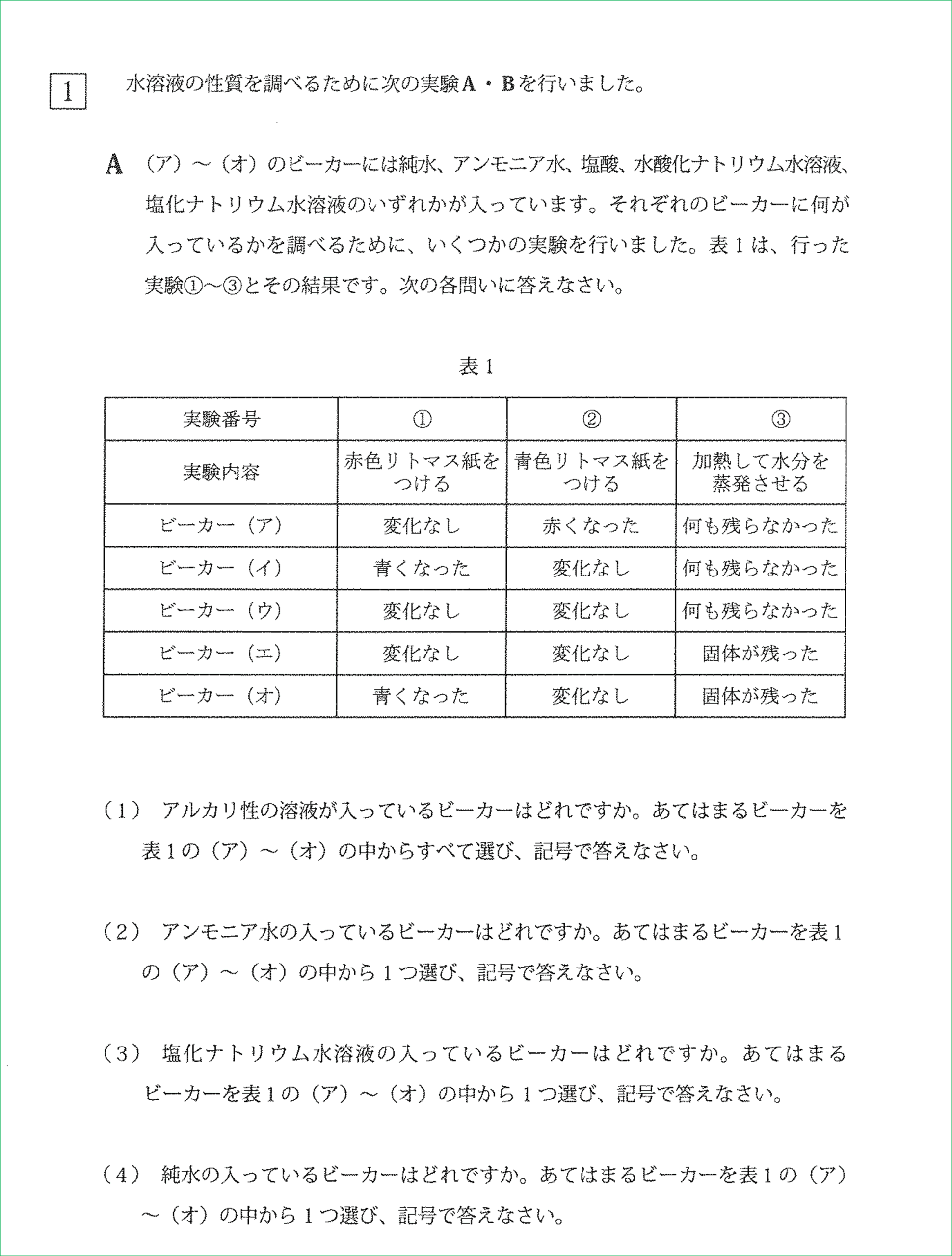 アルカリ性の水溶液では,赤色リトマス紙をつけると,赤色リトマス紙が青色に変化することが知られています。このことから,アルカリ性の水溶液はビーカー(イ)と(オ)のものであると判断できます。