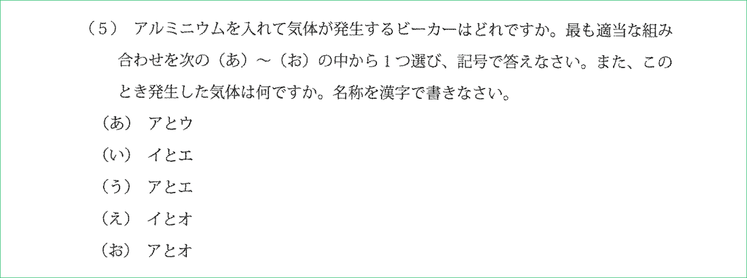 よってアルミニウムを溶かすのはビーカー(ア)と(オ)の水溶液ということになり,(お)が正解となります。