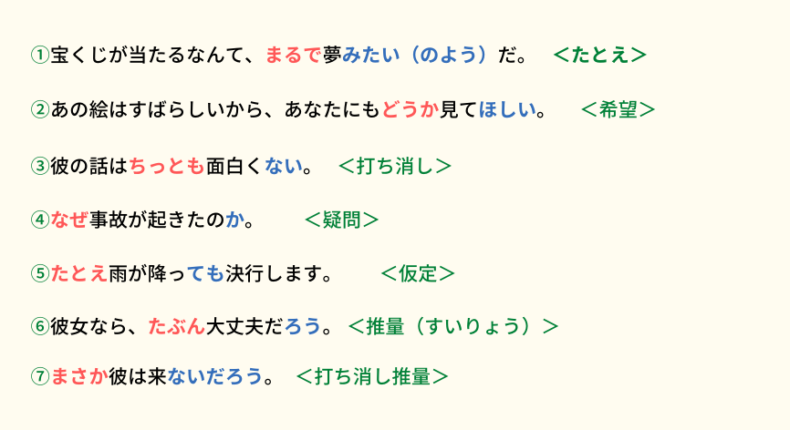 意味について(「推量」や「希望」など)名前を覚える必要はありませんが、それぞれの呼応の組み合わせは頭に入れておくようにしましょう。