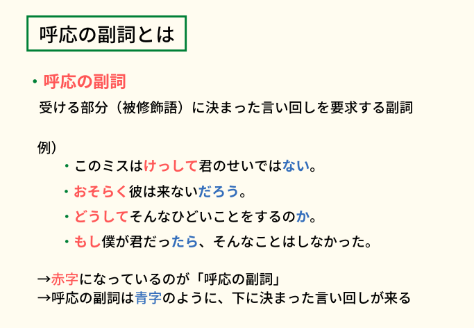 呼応の副詞とは、受ける部分(被修飾語)に決まった言い回しを要求する副詞のことです。