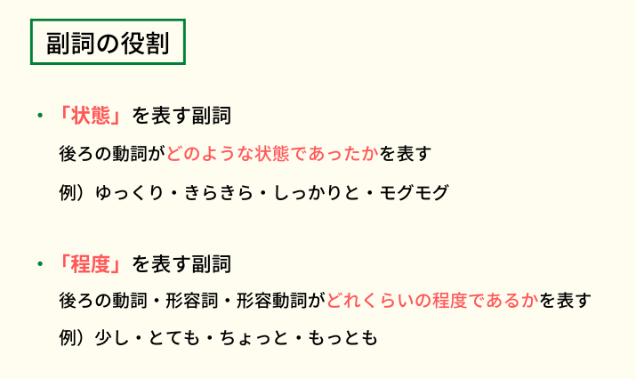 ⭐️状態を表す副詞 例)ゆっくり・きらきら・しっかりと・モグモグ
