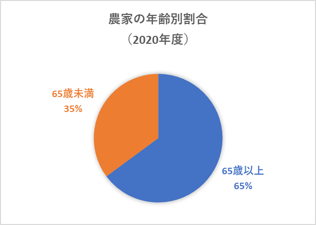 現在の日本の農家では高齢化が進んでいるという大きな問題点があります。2020年の調査では農業に就く人のうち65%が65歳以上であり、更に全体の26%が75歳以上です。また平均年齢は67.8歳となっています。