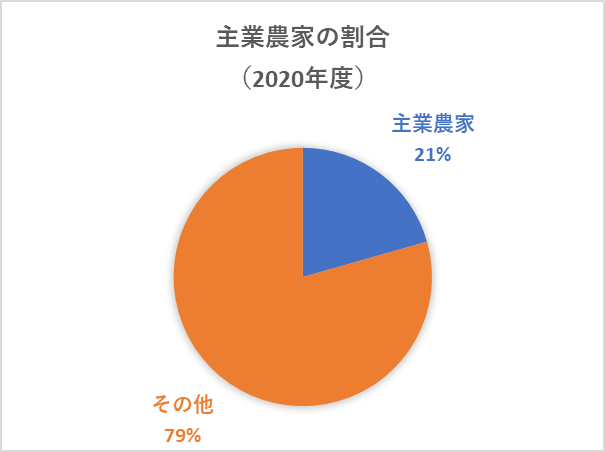 また、日本の農家は規模が小さいため、農業のみで生活を営んでいる(他の収入がない)専業農家の数は少なく、ほとんどの人が農業以外からも収入を得ている兼業農家であるという特徴もあります。農業からの収入が全体の50%以上をしめている主業農家の割合もおよそ20%と低くなっています。この主業農家の割合がだんだんと減少していることも頭に入れておくべきポイントです。