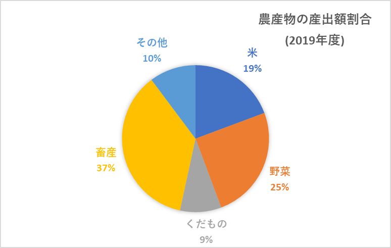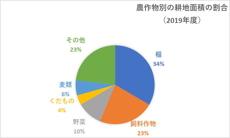 日本の農業は米の生産が中心です。農作物ごとに農地面積(作付面積)を見ていくと、もっとも割合が大きいのは稲となっています。その一方で生産額が最も多いのは米ではなく畜産物です。畜産物は米などと比べ単価が高いため産出額は高くなる傾向にあります。