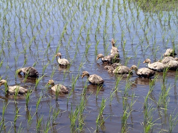 また、雑草や害虫を取りのぞくために使われる農薬の代わりに、水田にあいがもを放すというくふうを行う農家もあります(「あいがも農法」)。あいがもが雑草や害虫を食べてくれるため農薬を使う必要がなく、かものフンは肥料代わりにもなるため肥料も減らすことができるのです。更に、雑草や害虫を食べて育ったかもは食用にもなります。