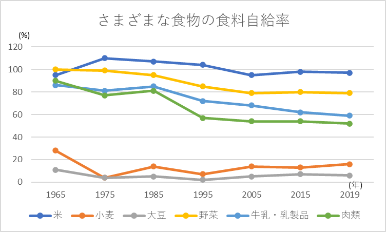 日本の農業の大きな問題点の一つが食料自給率の低さです。2019年度の熱量に換算した食料自給率は38%で、作物ごとに見ると大豆や小麦などの自給率が低くなっています(大豆は6%、小麦は16%)。