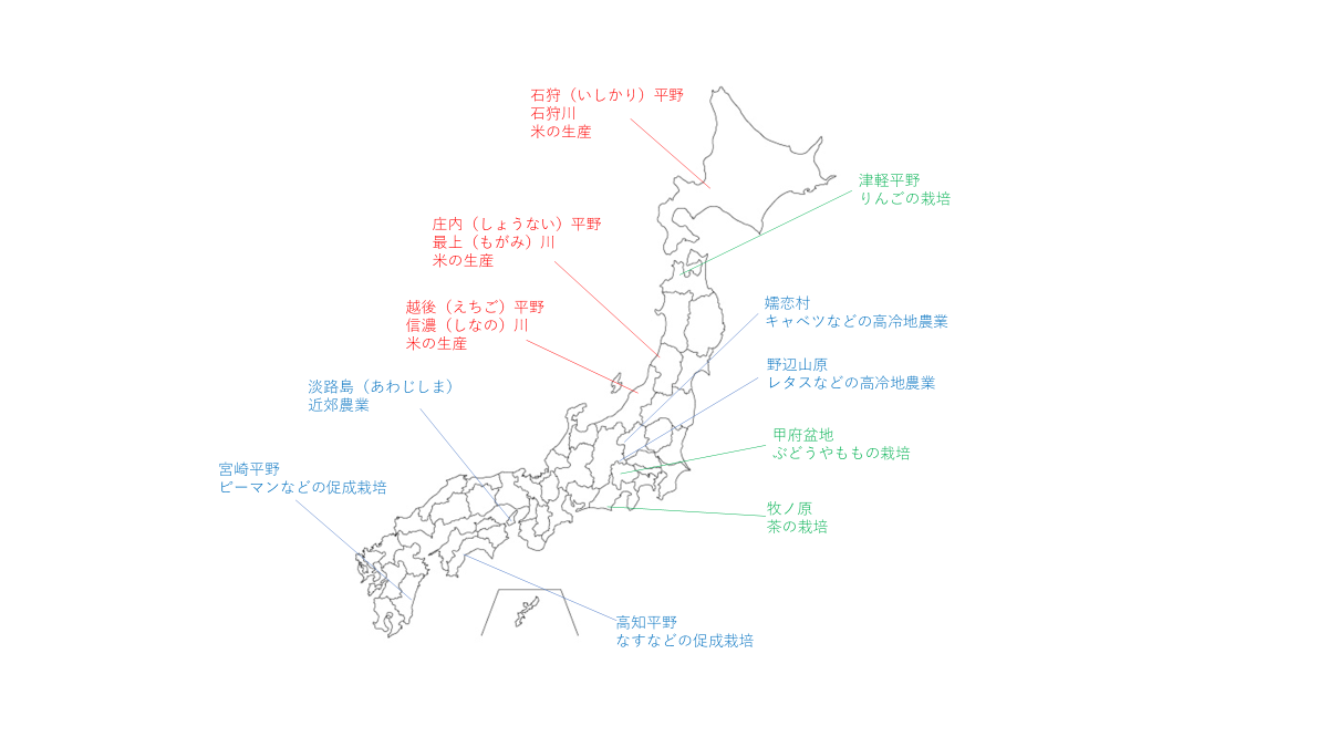 米づくり(稲作)において重要なのは、「平野と川」をセットで覚えることです。特に、東北地方や新潟県の平野についてはまちがえないようにしてください。