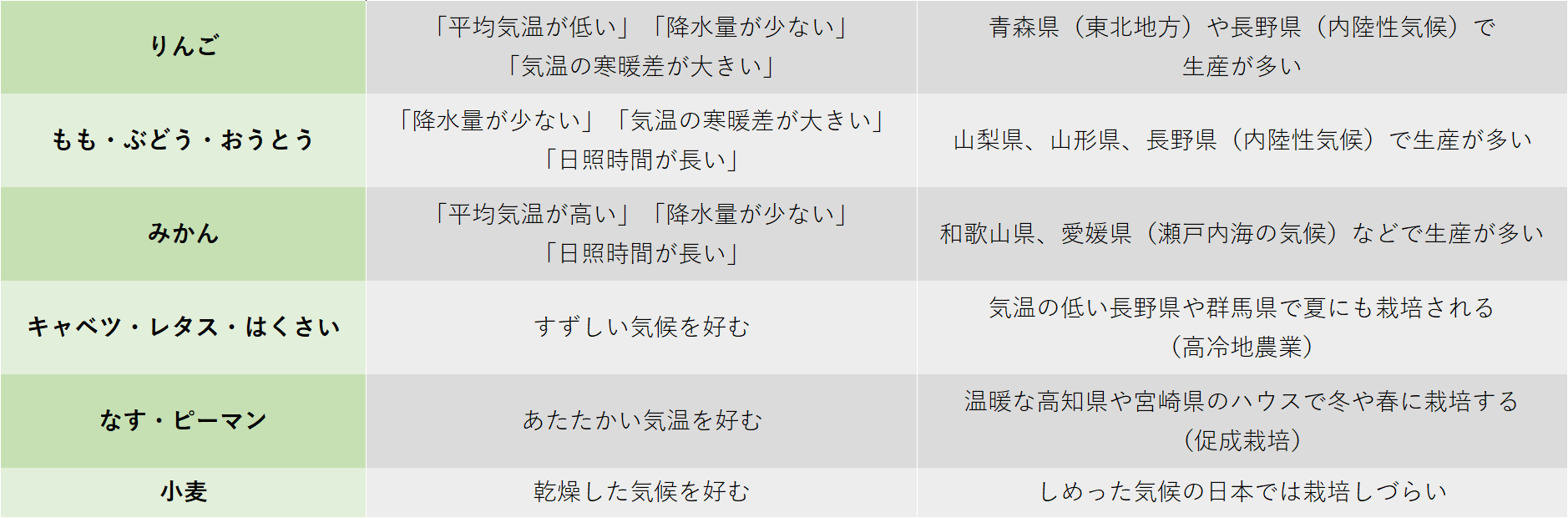 たとえば、美味しいりんごの栽培に適しているのはすずしく一年中降水量の少ないような地域です。そのため、平均気温の低い青森県や長野県(長野県は「内陸性気候」であり降水量が少ないのも特色です)でりんごの生産量が多くなっているのです。