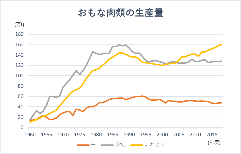 種類別に生産量を見ていくと、にわとりの肉の生産量が最も多くなっています。