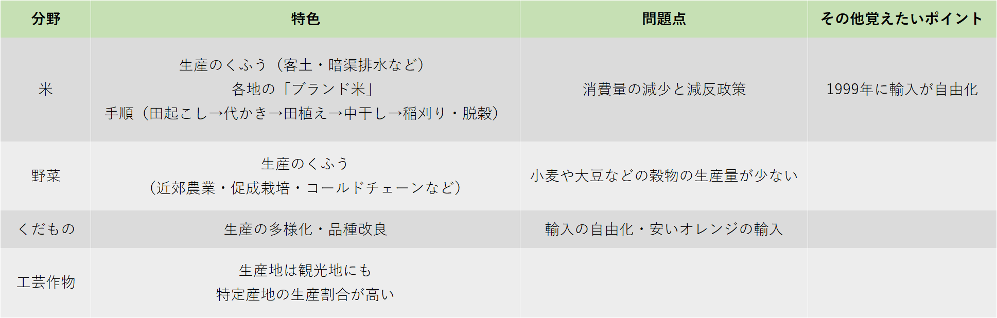 それでは、「農業」の分野についておさらいしていきましょう。これから学習するという人も予習用にもぜひ読んでみてください。ポイントは「都道府県」「生産地」「生産の特色と問題点」の3つです。