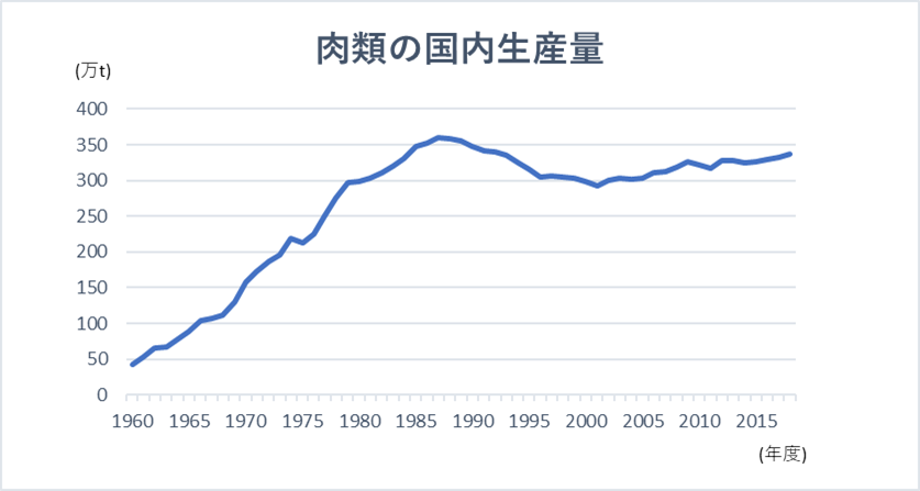 肉類の生産量は、昔と比べて大きく増えています。肉類の生産量・消費量が増えた背景には「食生活の洋風化」があります。稲作の記事でも触れたように、米や魚の消費量が減った一方で肉類の消費量が増え、それをまかなうために国内の生産量や輸入量も増加しました。