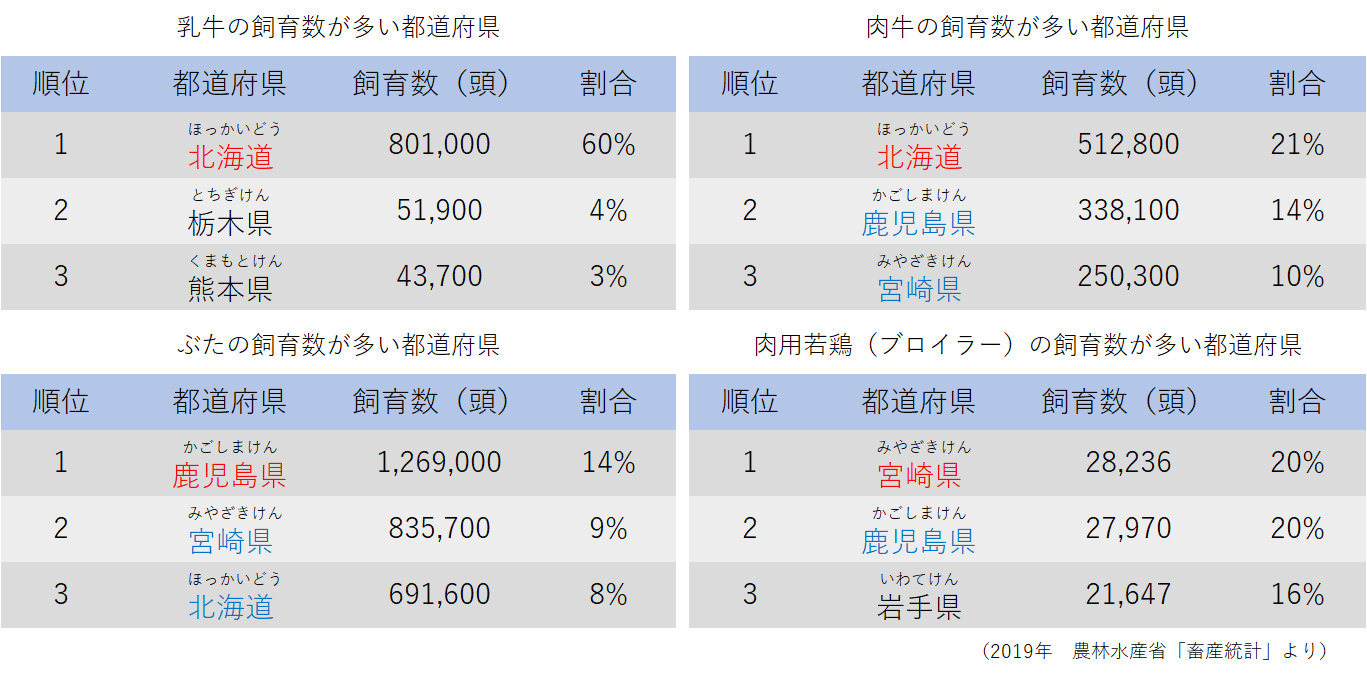 それでは、肉牛、乳牛、ぶた、肉用若鶏(わかどり)(ブロイラー)の飼育数を都道府県別にみていきましょう。酪農(牛乳などを生産すること)に用いられる乳牛と、食べるための肉牛を区別するところに注意してください。