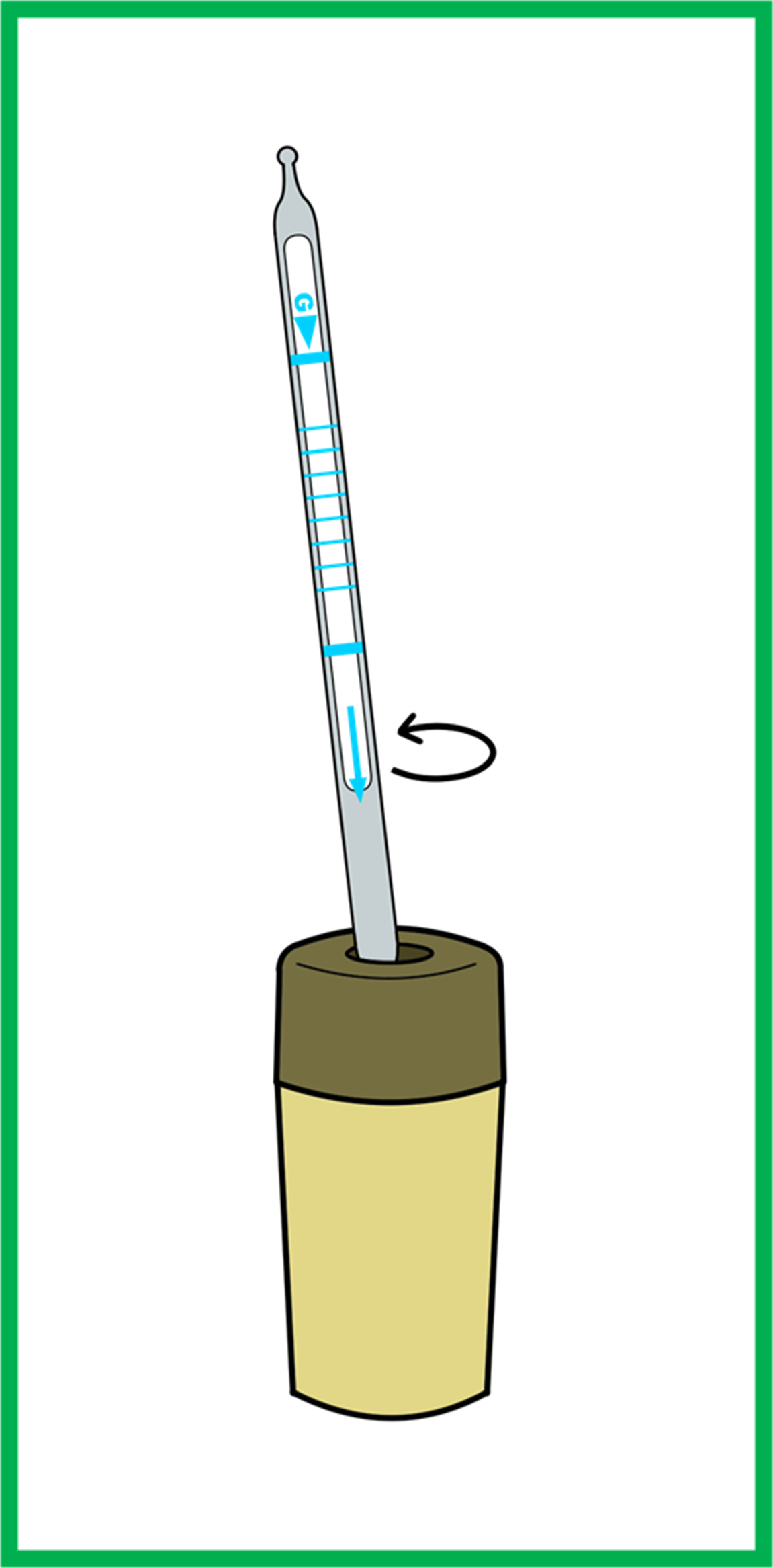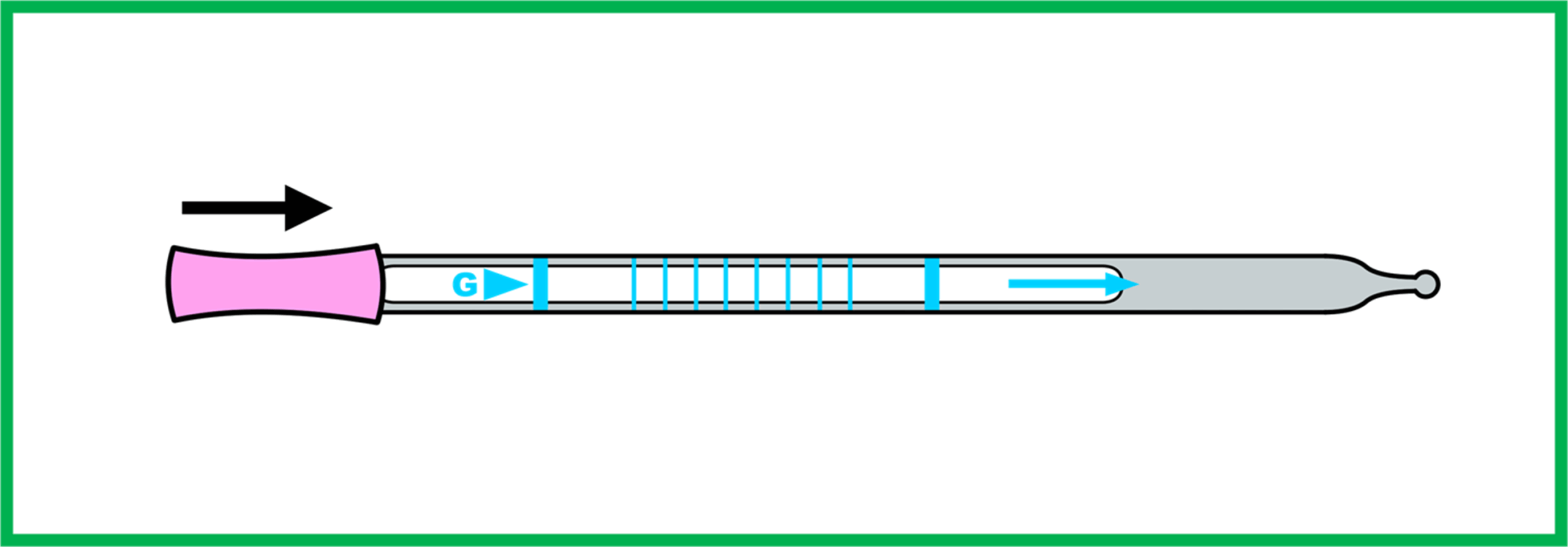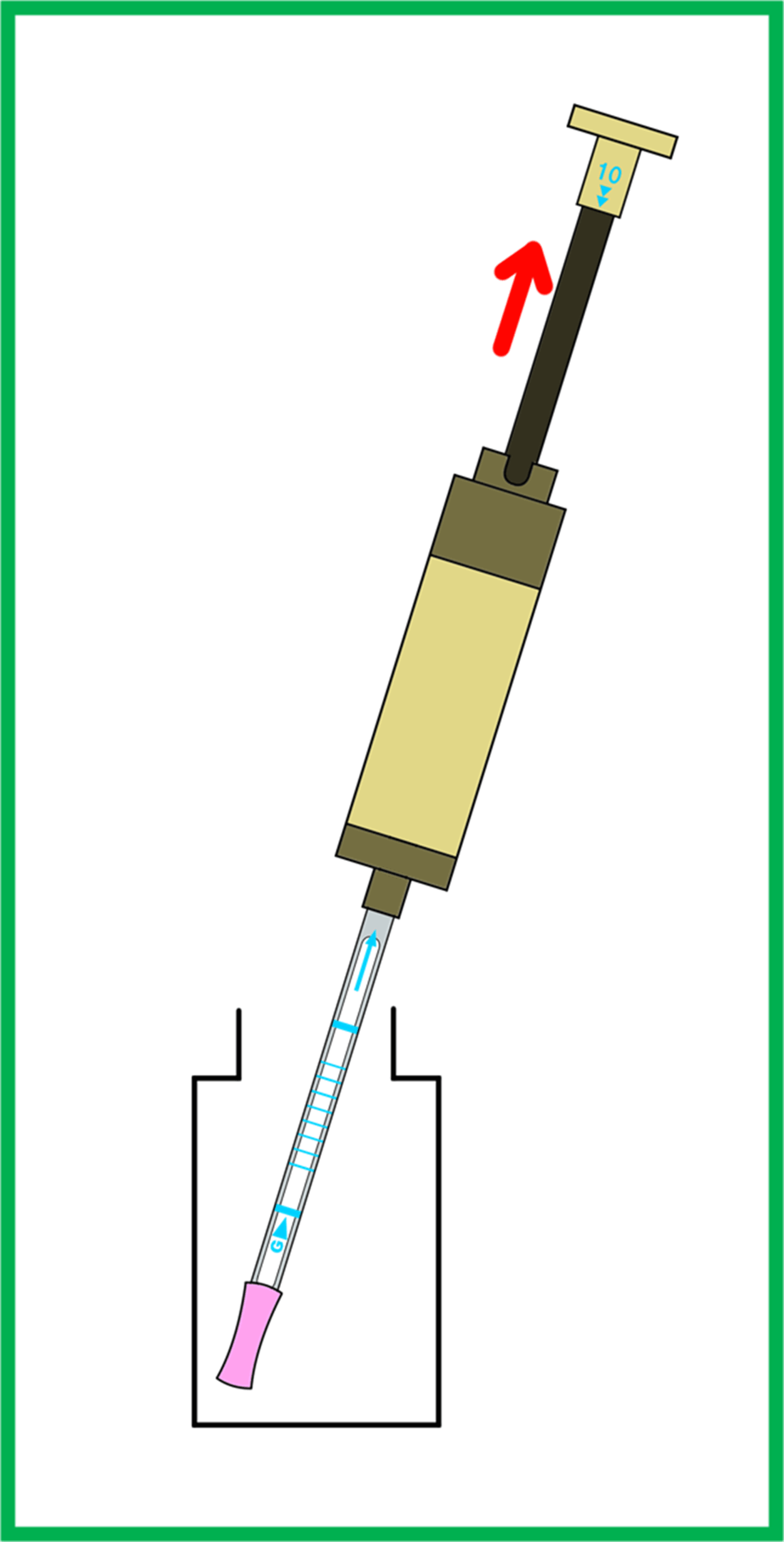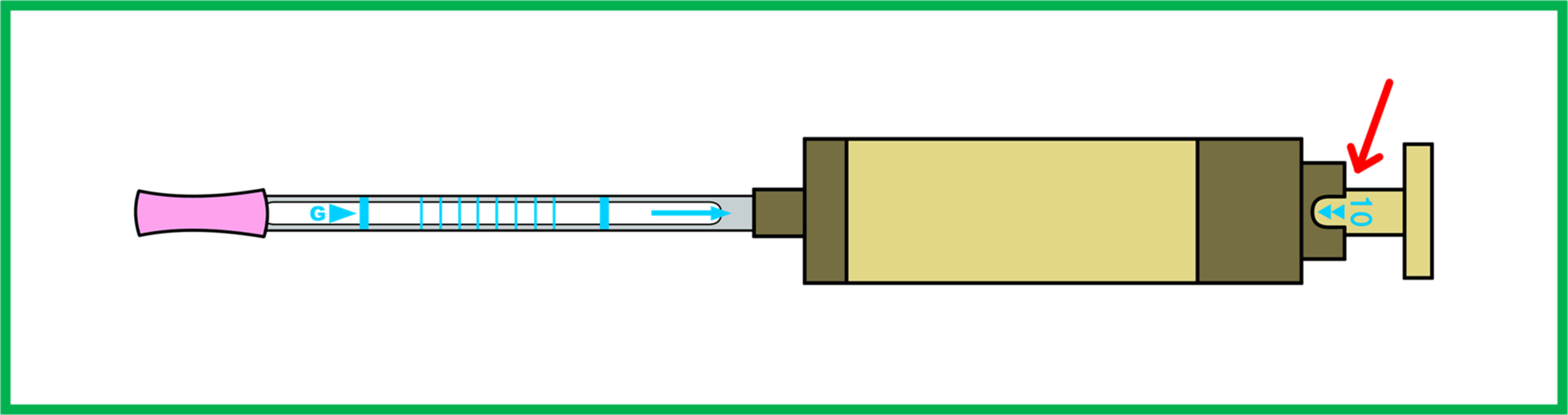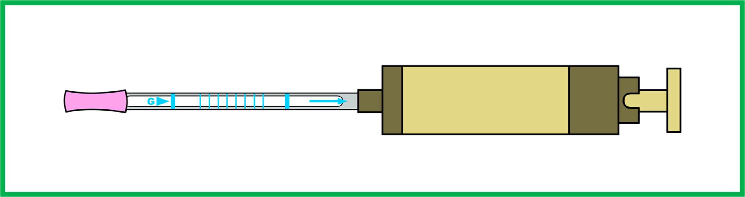 気体の割合を調べたいところに気体検知管を入れて,印を合わせてからハンドルを一気に引いて空気を取り込み,そのまま固定します。
