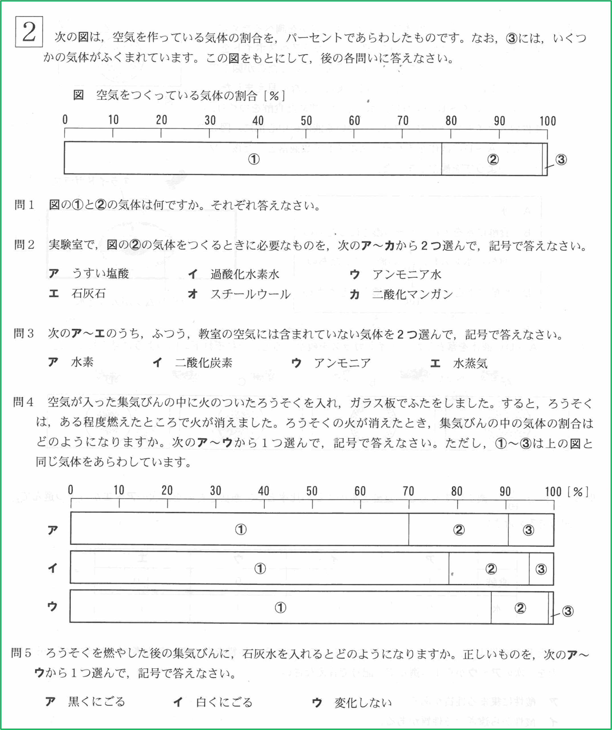 気体の物質についての問題として, 大気 中の気体の組成という観点から出題されることがあります。呼吸に大きく関係する酸素や二酸化炭素はよく扱われますが,その他の物質がおろそかになりがちです。