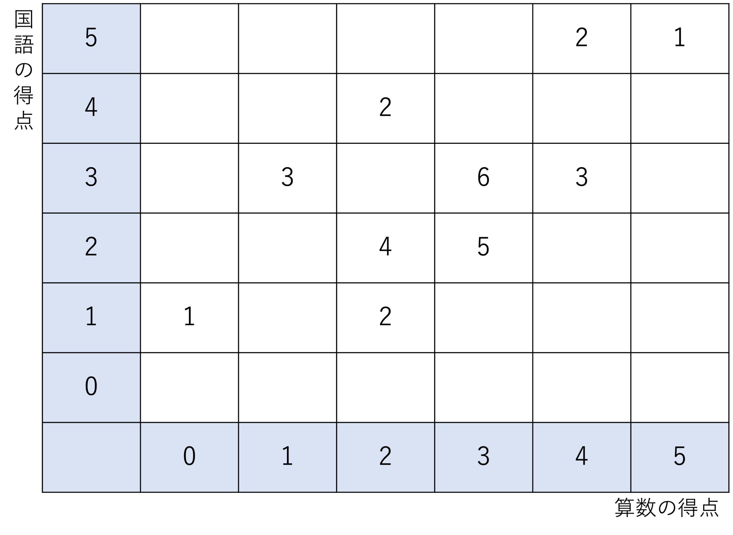 それでは3問目の解説をして本記事を締めくくっていきます。はじめにこの表の見方を確認していきましょう。この表はいわばグラフのような形をしていて,縦軸と横軸にそれぞれの点数があり,国語と算数でとっている点数にしたがってマス目に当てはまる人数を書き込んでいく,という仕組みで作られています。やや見慣れない形ではありますが,基本の形は表と同じですので,あまり難しく考えすぎず進めていきましょう。