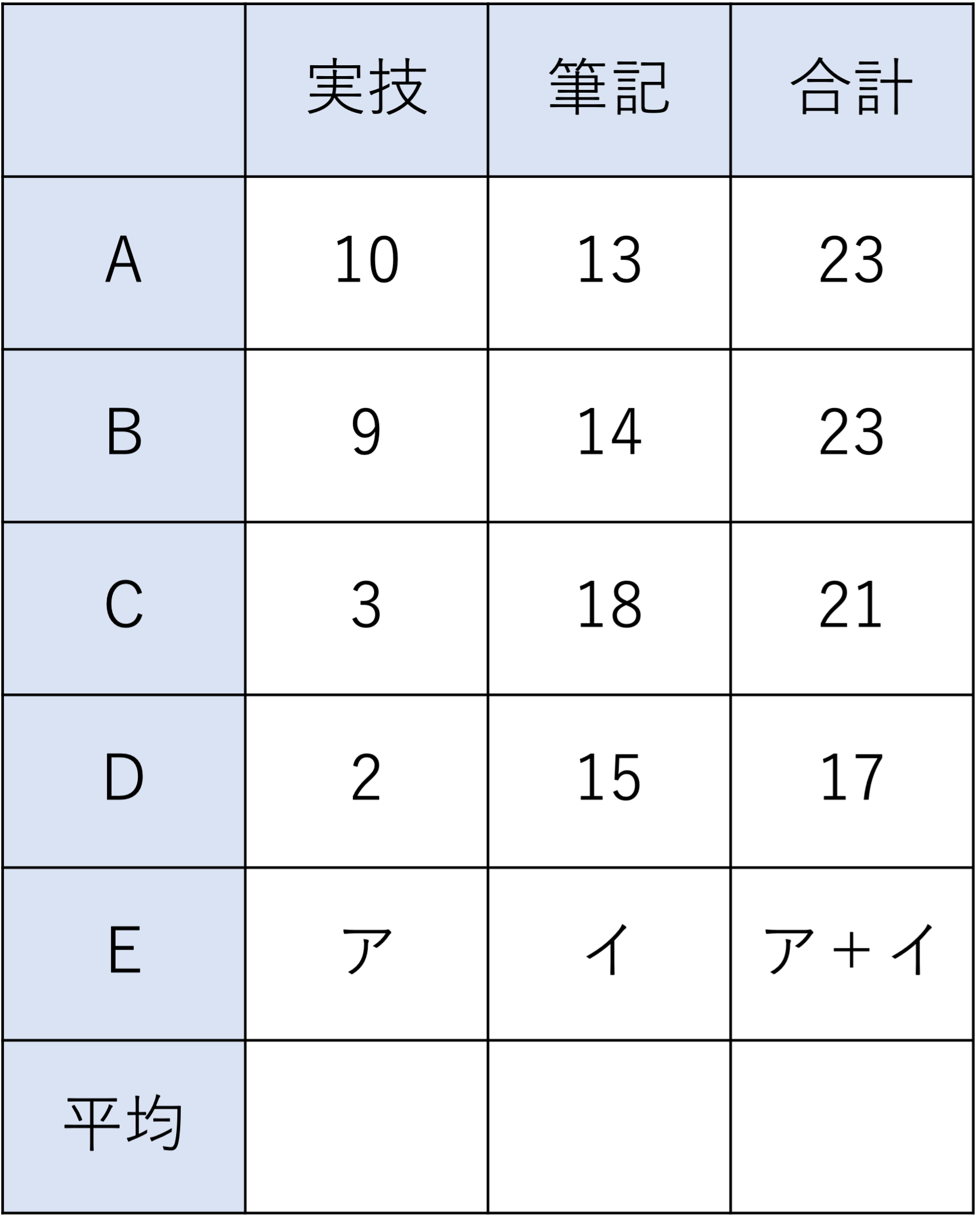 A,B,C,D,E5人の志願者に実技試験と筆記試験をしました。それぞれの満点は10点,20点で,A,B,C,D4人の得点は下の表の通りです。合計点の5人の平均点はちょうど20点でした。