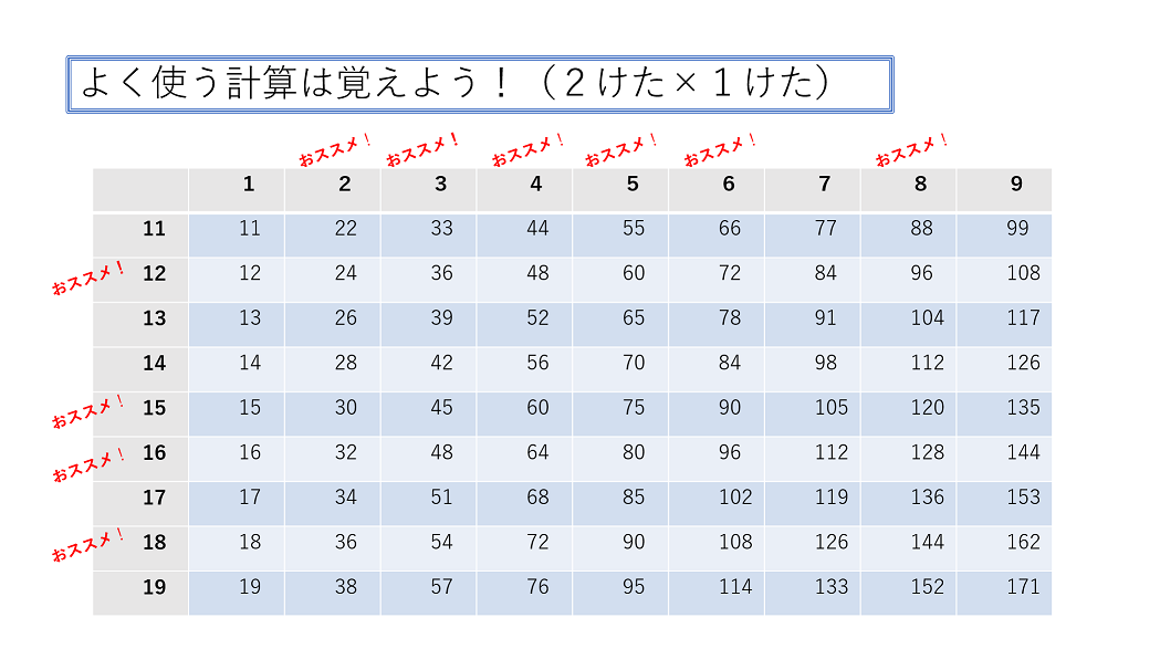 「おススメ!」の書いてある列は特によく使うので覚えておいて損はないですよ!縦と横の両方におススメのついている計算(12×2~12×6など)は特におススメ度合が強いです。ここには入っていませんが、24のかけ算などもおススメしたいですね。