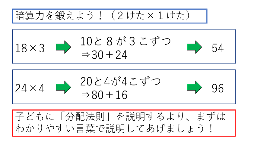 では次に、「18×3はいくつ?」「24×4だったらいくつになる?」というように問いかけてみましょう。すぐに暗算で答えが出ない場合には、次のように教えてあげると効果的です。