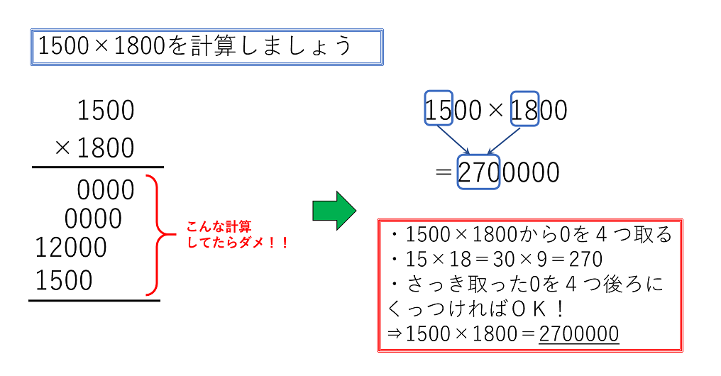 計算の工夫を組み合わせれば、上の図のように「1500×1800」も暗算でできるようになります。