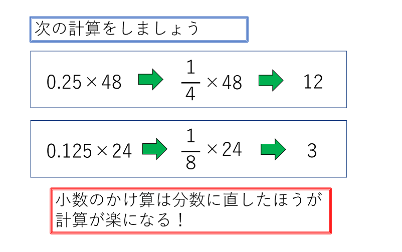 小数のかけ算は、基本的には整数のかけ算と同じように筆算します。しかし、小数は分数に直すことができます。分数のかけ算は途中で約分をして計算するので、計算が楽になるのです。