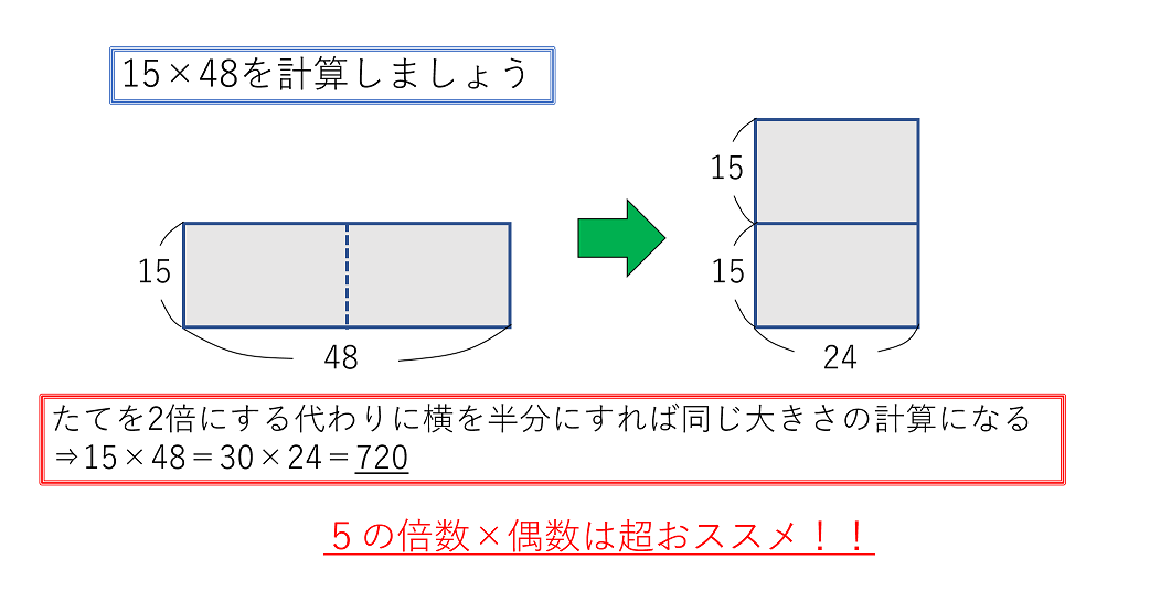 15×48=30×24=720となります。30×24の計算は「3×24の72に0をくっつけるだけ」です。