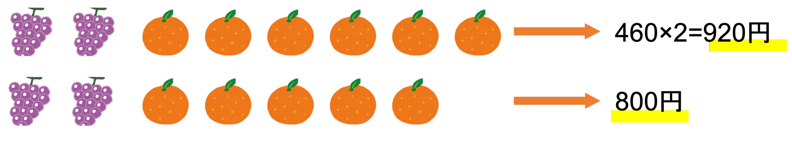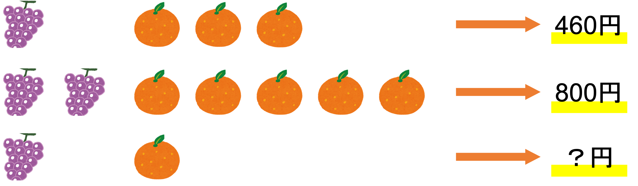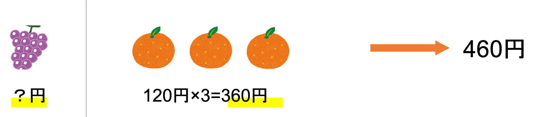 このことからぶどうの値段は100円だと求められました。以上のことからぶどうは100円・みかんは120円とわかります。