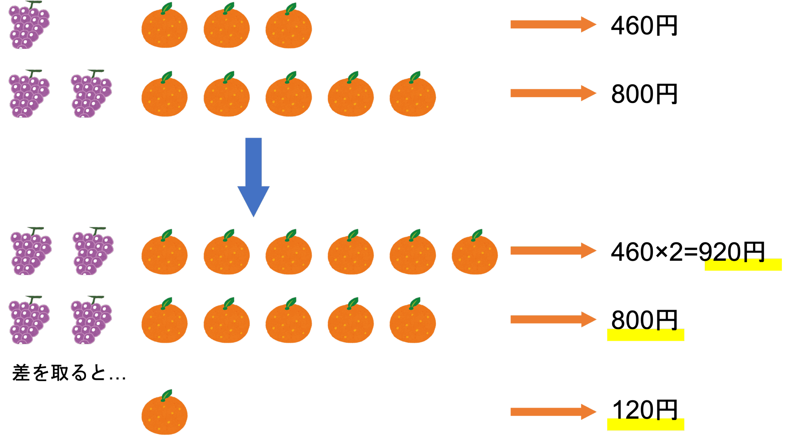 今回は「ぶどう1個・みかん3個」で460円という関係をすべて2倍すると,ぶどうの数が2個で揃えられますね。この上と下とを比較すると,みかんが1つ増えると値段が120円高くなるという関係がわかります。このように片方を揃えて差を求める,つまり消去すると一方の価格が求まります。
