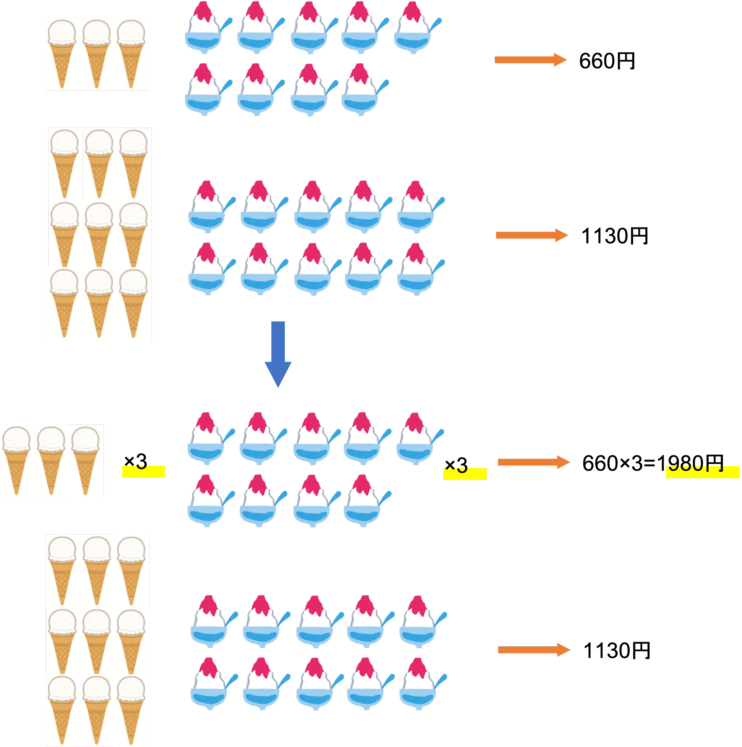 したがって上の図のように,アイス3個・かき氷9杯の条件を3倍すると,アイスクリーム9個・かき氷27杯で1980円という新たな条件を導けました。