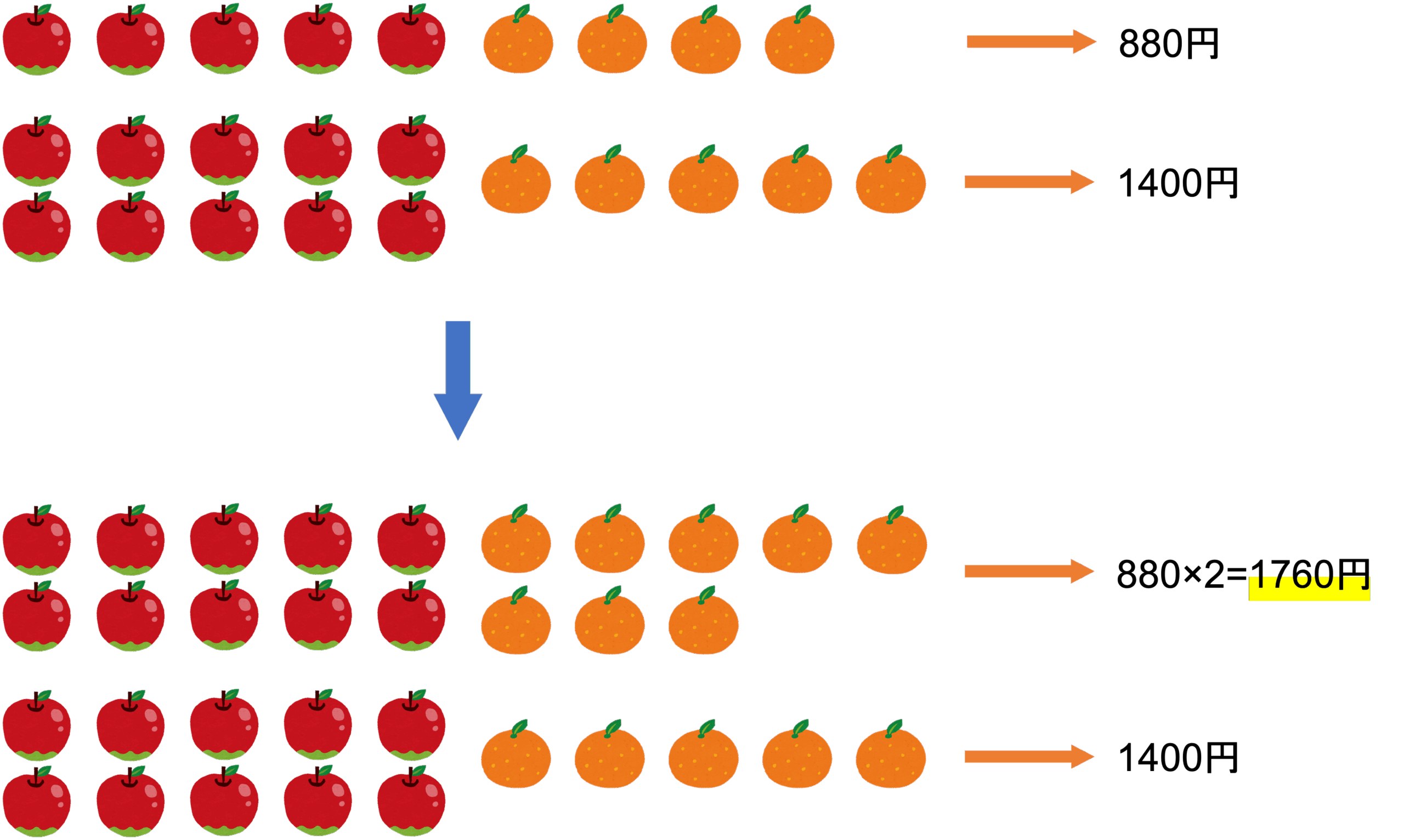 今回はみかん1つで120円増える,つまりみかんは120円とわかりました。ただこれはみかんが2個でも3個でも問題ありません。その場合,全部合わせたときの金額をものの個数で割ればいいので,柔軟に対応しましょう。