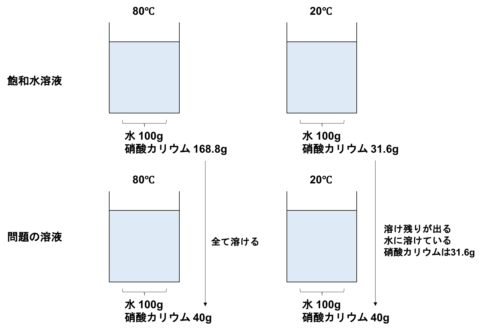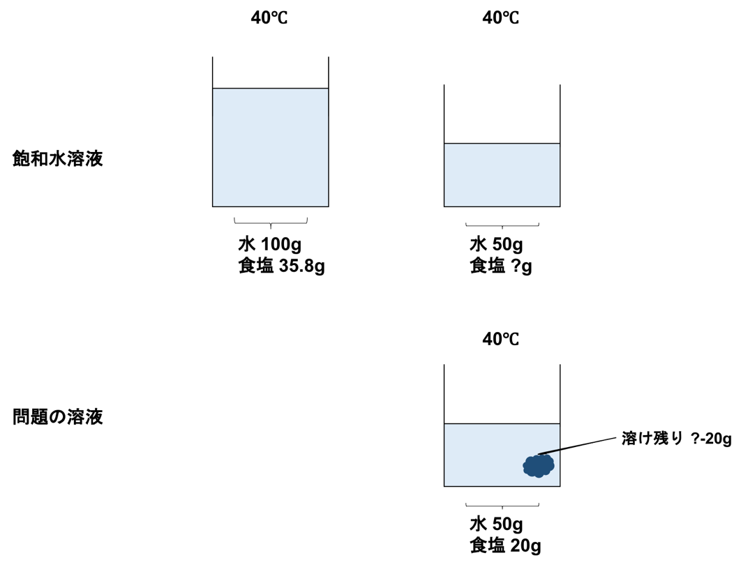 溶解度、加えた溶質の量、溶け残りの量などを整理して考えることが大切なのがわかりますね。