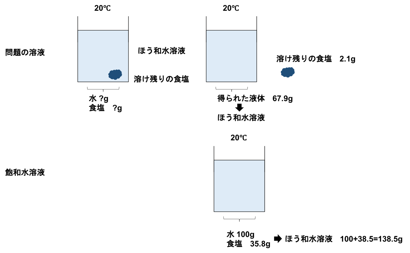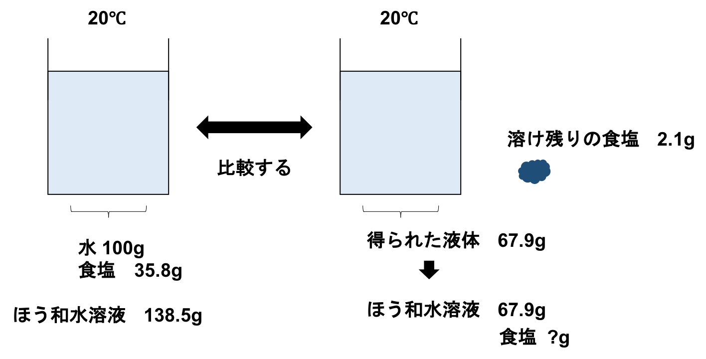 20℃の水100gは食塩35.8g最大で溶けることができ、この溶解度でのほう和水溶液の重さは\(100+35.8=135.8g\)です。