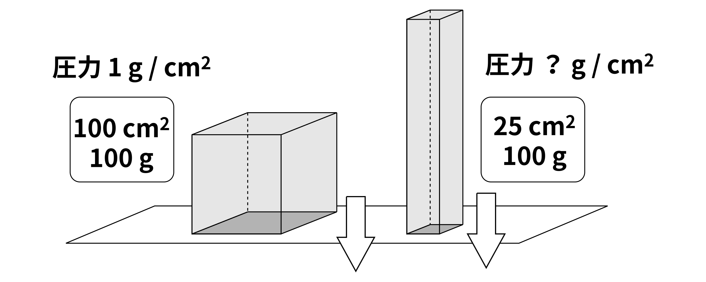 となります。ここで、力と書きましたが、中学受験の範囲ではこの力を重さと置きかえても大丈夫です。圧力は、「同じ面積あたりの力(重さ)の大きさ」という情報を教えてくれる値です。具体例をみながら考えましょう。