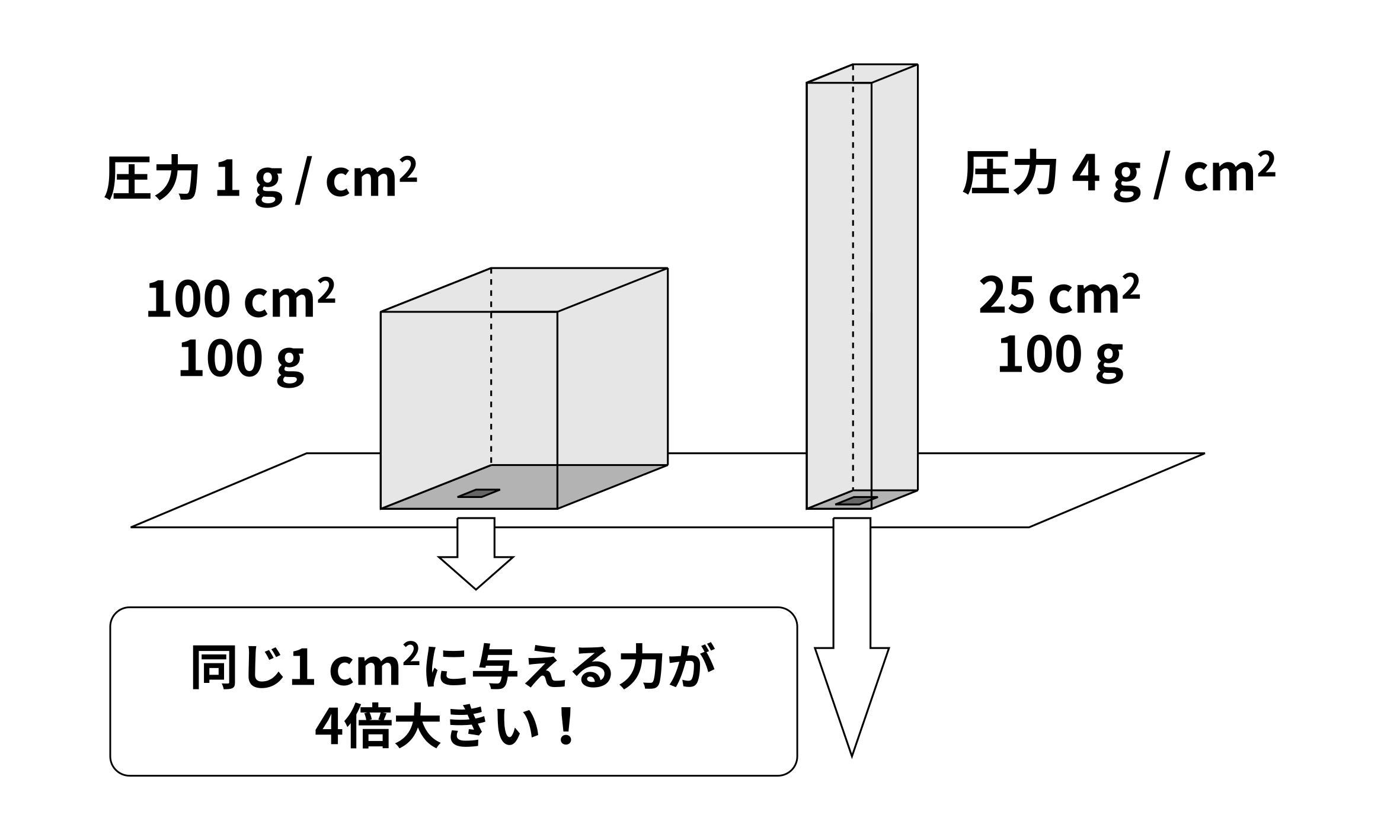 結果から何がわかるでしょうか。同じ重さの木片なのに、床に与える圧力は4倍も異なっています。先ほど、圧力は同じ面積あたりに与える力を教えてくれると書きました。つまり、個々の木片全体で見れば、床に加える力(重さ)同じですが、木片の中のある同じ面積(例えば\(1\,\mathrm{cm^2}\))で考えれば、力を加える面積が小さい方がより大きな力を加えるということになります。