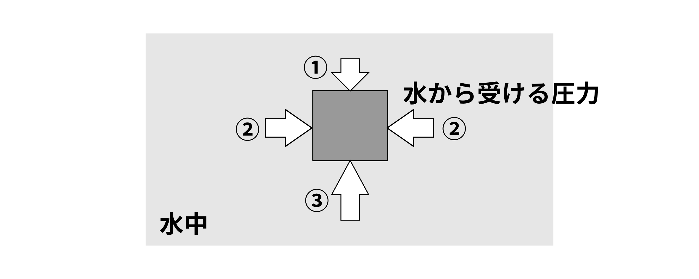 水圧とは、単に水による圧力のことに過ぎないのですが、水は物体を取り囲んで全体から力をかけるので、通常考える力とは違っていることが問題を難しくしているといえます。