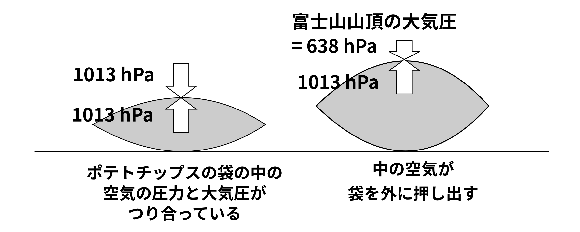 ポテトチップスは開封されていないので、標準的な大気圧をもった工場の空気が中に入っています。この袋を大気圧の低い場所の中に持っていくと、袋の中の空気の圧力の方が大きいので、袋の中の空気が袋を外に押し出すような力をかけ、ふくらんでいくのです。