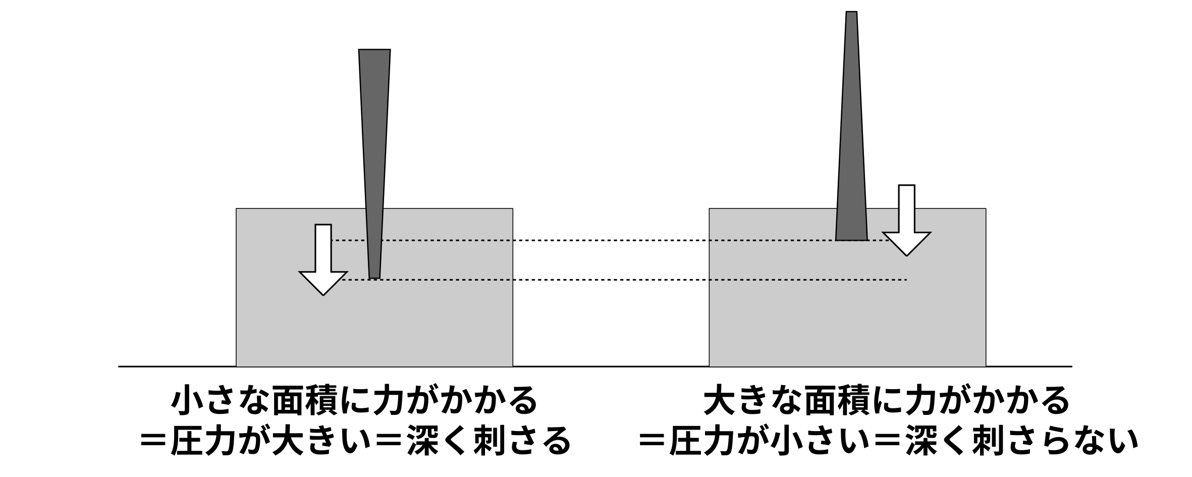 - 圧力は、同じ面積あたりの力(重さ)の大きさである