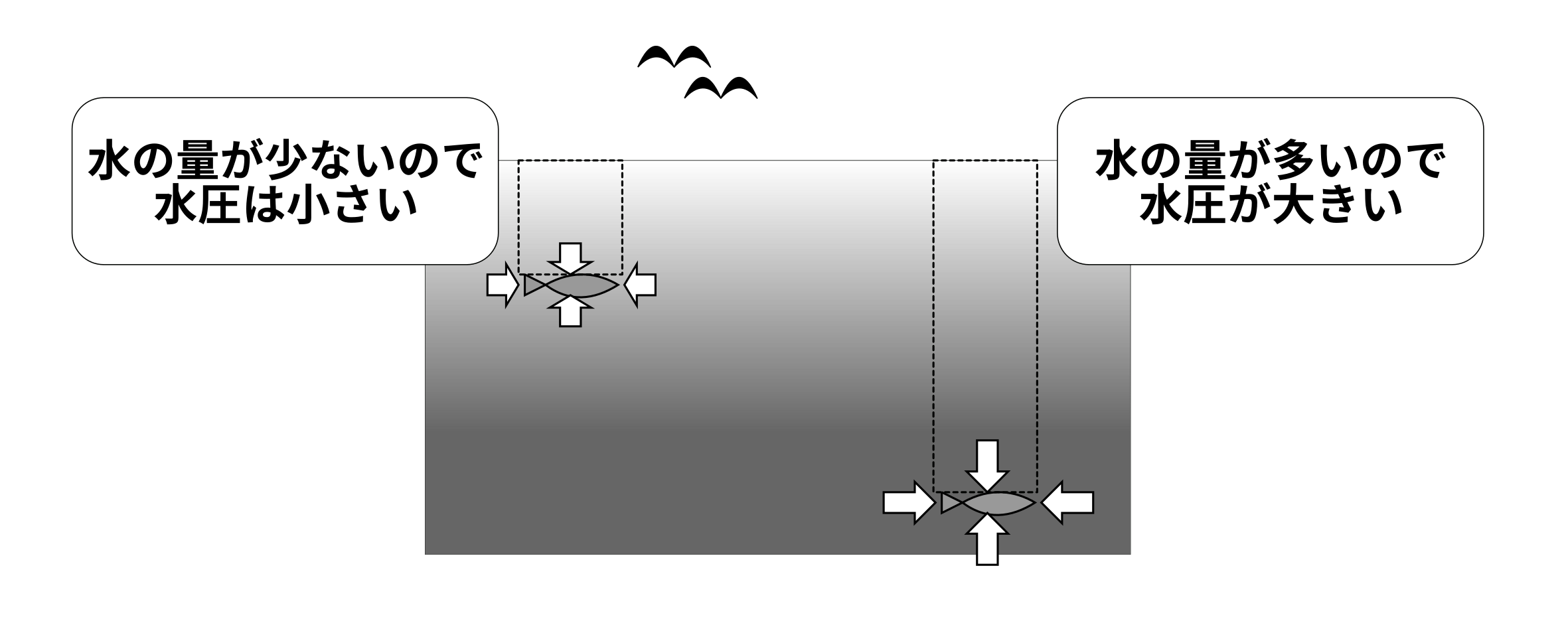 - 水の深さが深ければ深いほど、水圧は大きくなる