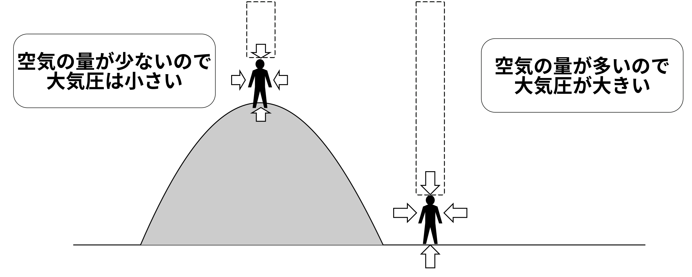 - 標高が高ければ高いほど、大気圧は小さくなる