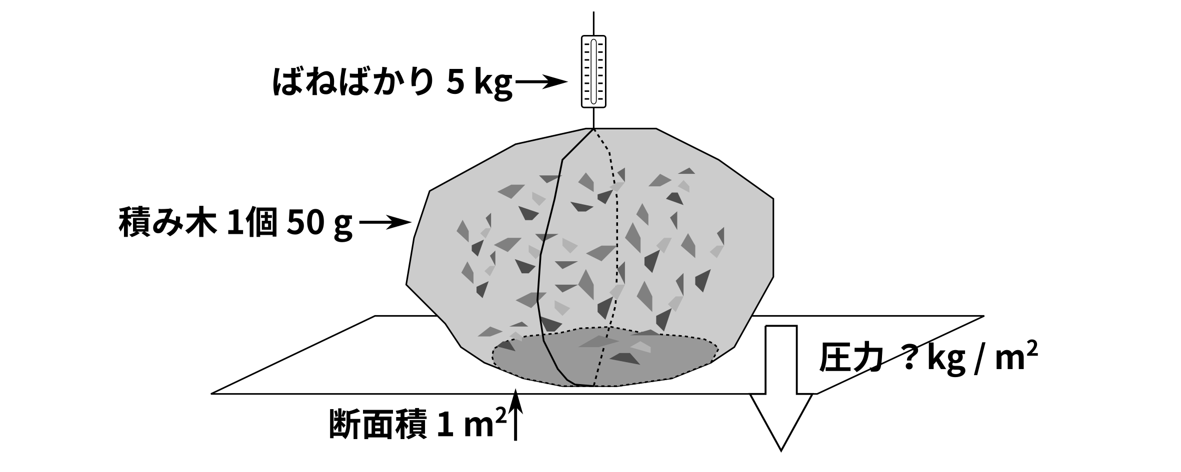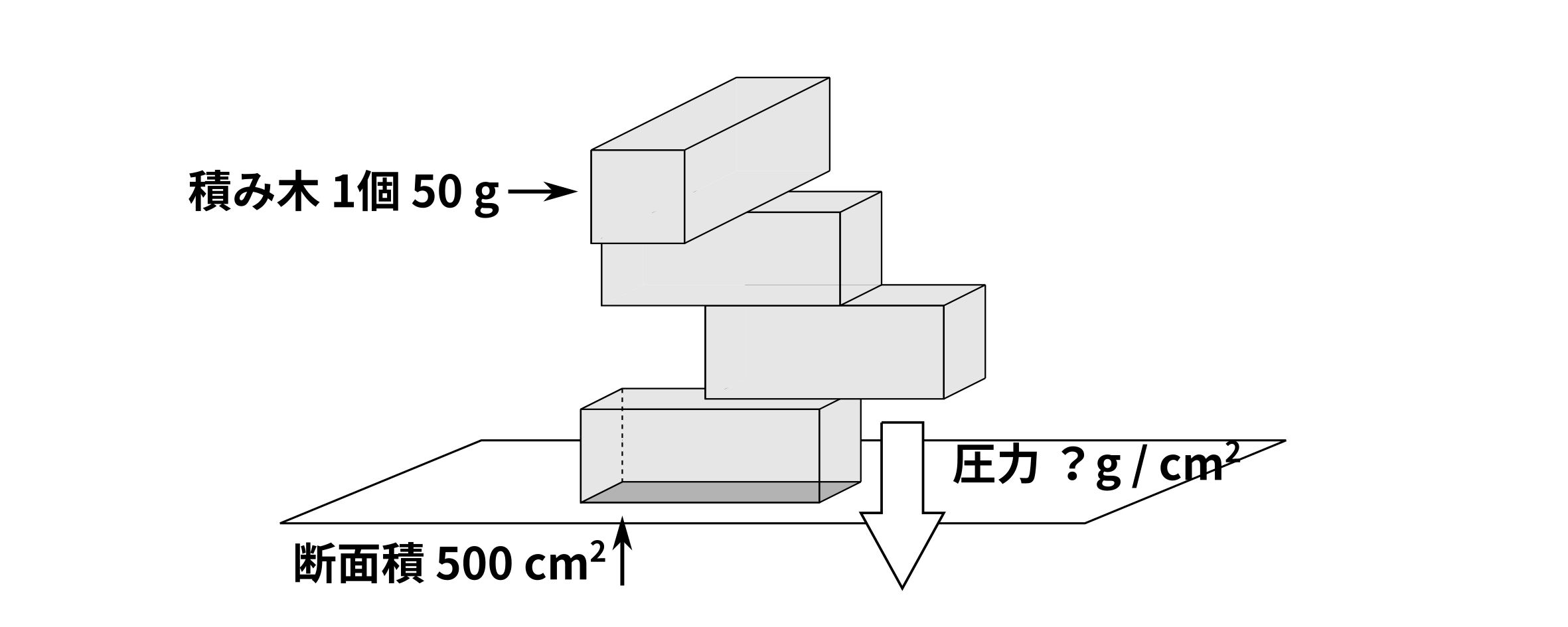 単純な圧力を求める問題です。積み木が様々な場所におかれているので、迷ってしまった人もいるかもしれませんが、下から2個目以降の積み木の積み重ね方は圧力に関係しません。力がかかっている面積と全体の重さがわかっていればよいので、積み木が4つあることと、床との接地面積が\(500\,\mathrm{cm^2}\)であることだけ確認しておきましょう。今回の場合の圧力は