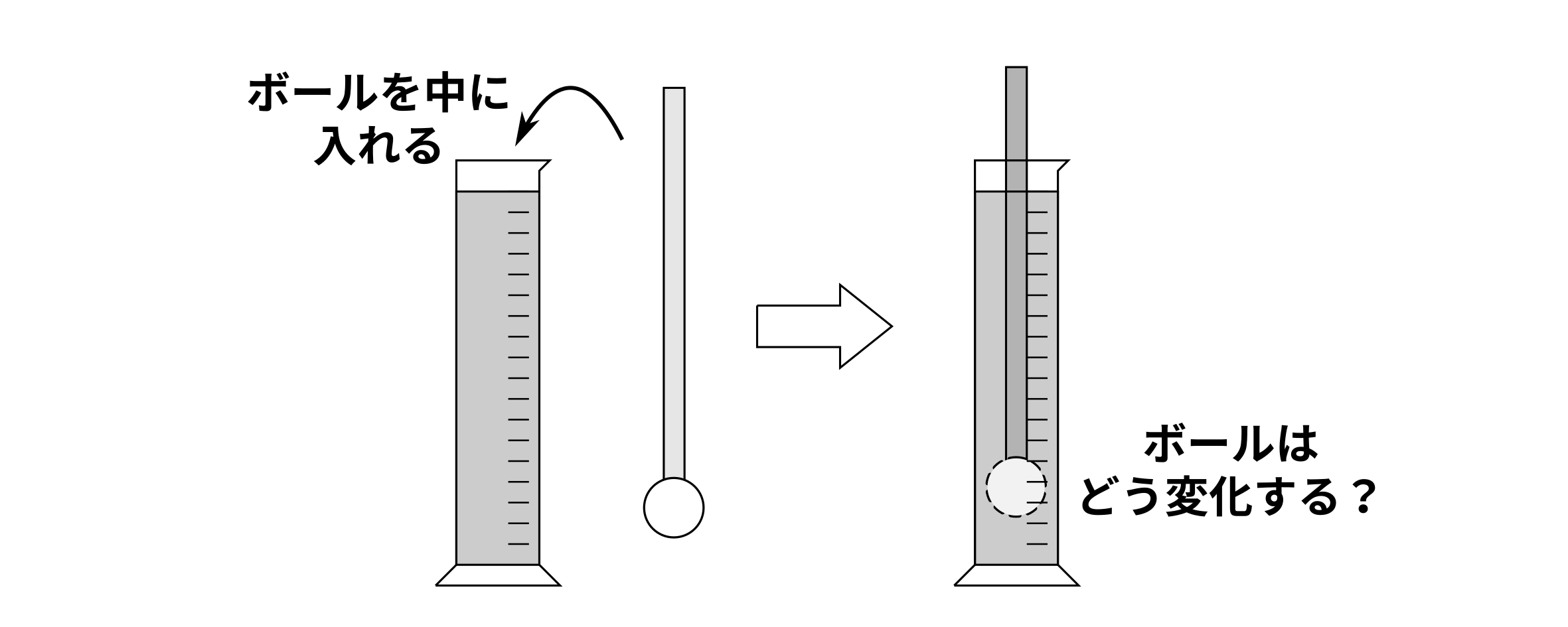 次の図のようなシリンダーの中に、水が入っています。十分に長い棒の先端にゴムボールを取りつけ、ゴムボールを水中に沈めます。ゴムボールの内側は空洞になっており、中は空気でつまっています。また、ゴムボールの中に水は入ってこないとします。ボールをシリンダーの中に入れたとき、次の文章に当てはまる言葉を答えなさい。