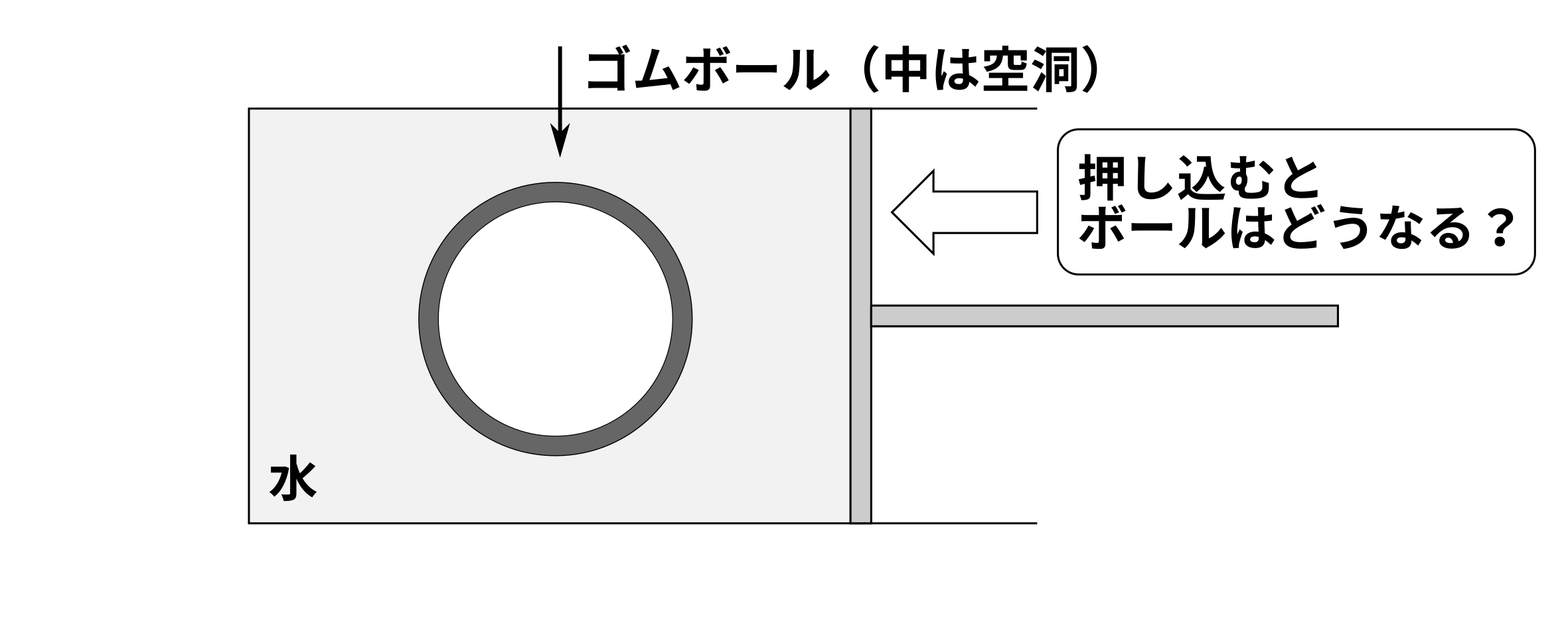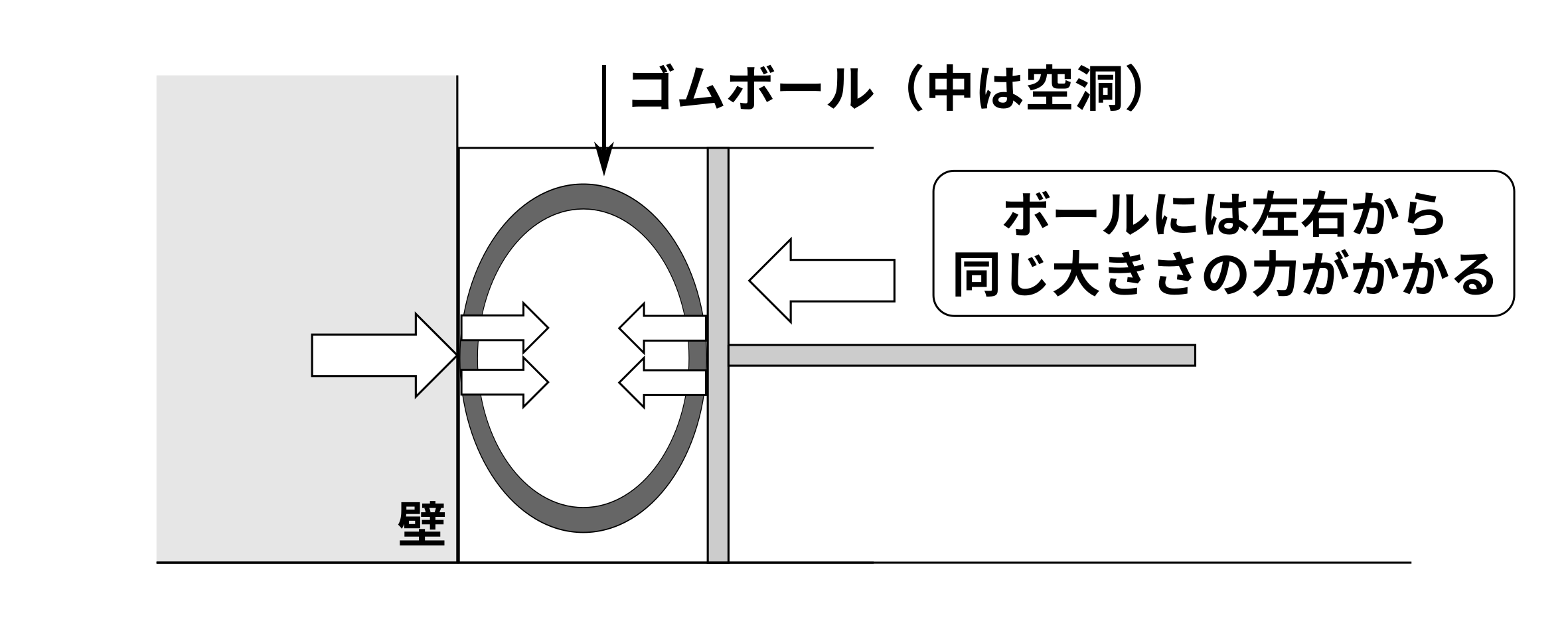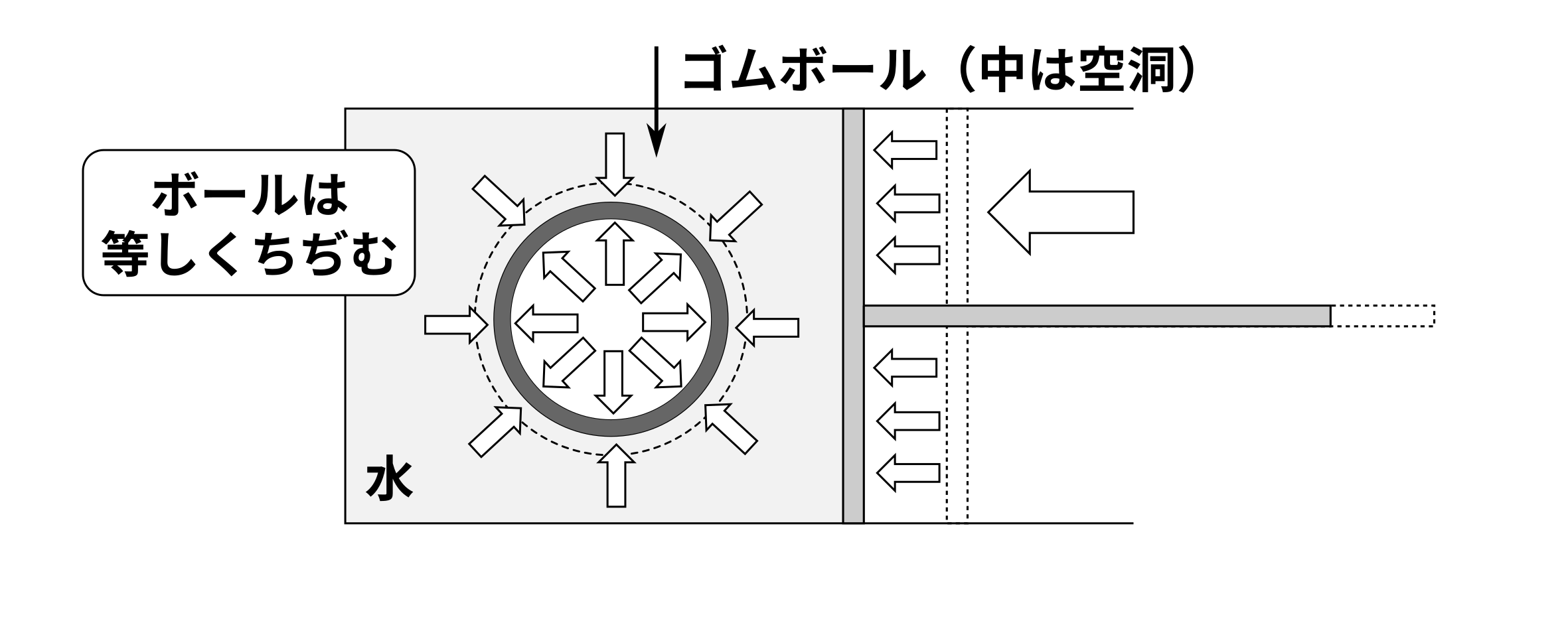 さて、水の中の話に戻りましょう。板と筒の例から、力は物体の中を移動することがわかりました。力は、水の中でも同じように伝わります。先ほどから繰り返しているように、水は変形可能です。このとき、水は力を全方向からかけることができます。つまり、板の例では横方向にしか伝わらなかった力が、縦横斜めすべての方向に広がることになります。したがって、ゴムボールはすべての方向に関して押し返す力が弱いので、すべての向きに等しくちぢむというわけです。