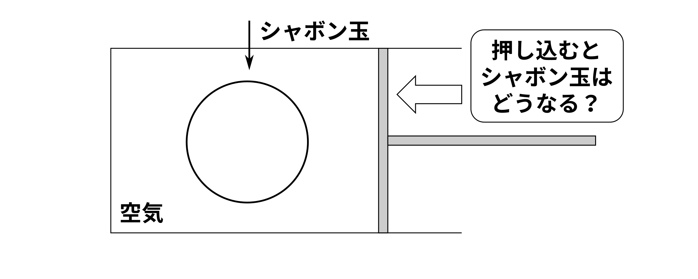 です。空気も水と同じように、シャボン玉の全方向に力がかかります。筒の中は空気が充満しているので、シャボン玉に力を直接加えなくても、空気が力をかけてくれます。