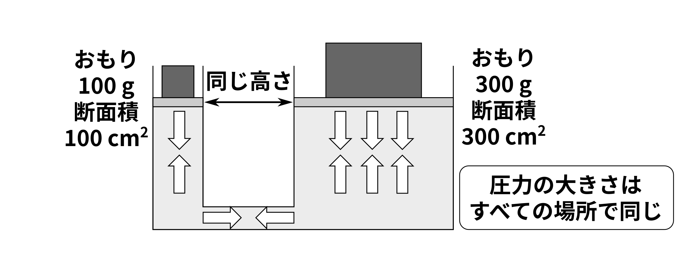 重いおもりの方が大きな面積の板の上に乗っているため、重いおもりと小さいおもりが板を通して水にかける圧力は同じです。