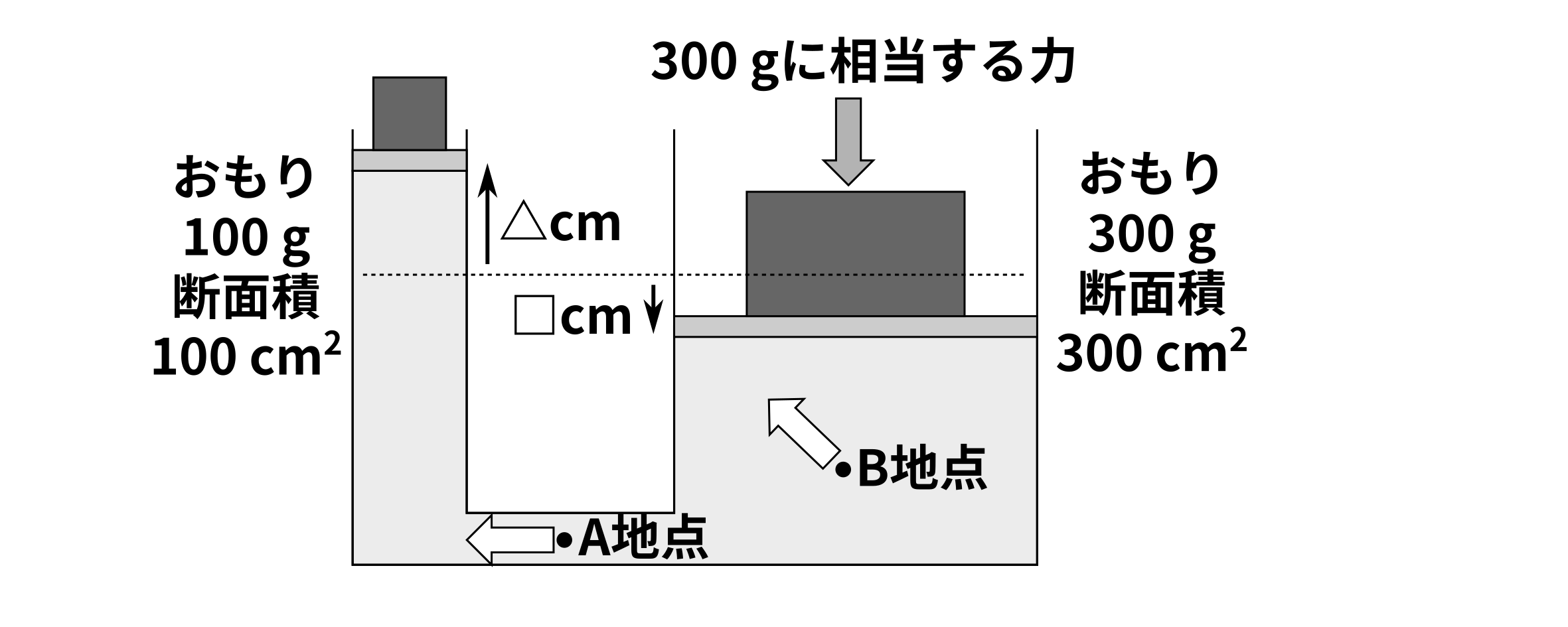 (左側の板が上がった距離)=\(300\,\mathrm{cm^3} \div 100\,\mathrm{cm^2} = 3\,\mathrm{cm}\)