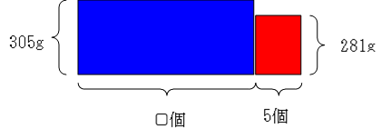 りんご5個を除いた後に残った個数を▢個とすると、問題文よりこの▢個のりんごの重さの平均は305gだと分かります。
