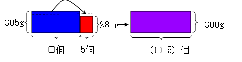 また、りんご全部の平均の重さは300gで、個数は(▢+5)個となります。これをまとめると下の図のようになります。