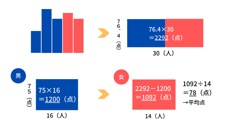 よって、女子の平均点は\(1092\div14=78\)点です。