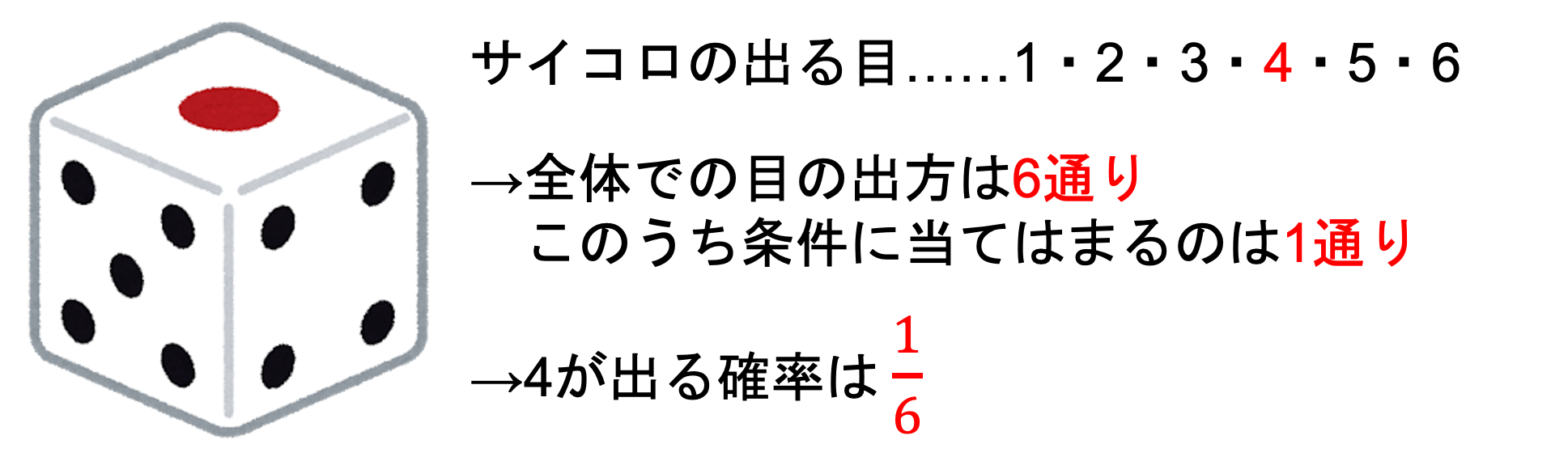 続いて確率についてお話ししていきます。確率とは,ある事柄が発生する可能性のことを指します。この確率は分数で表します。このとき分数の分母には全ての場合の数が,分子には特定の事柄が起こりうる場合の数がきます。先程のさいころを1回振って4が出る,というケースについて,その確率という観点から改めて考えてみましょう。このときの全ての場合の数とは,さいころから出てくる可能性のある目がいくつあるか,ということと等しいです。今回は全部で6通りですね。(以降も特に言及しませんが,各目の出る確率は同様に確からしいという前提が必要です)このうち4が出る場合の数は,上で見たように1通りしか存在しません。したがって答えは\(\frac{1}{6}\)となるのです。